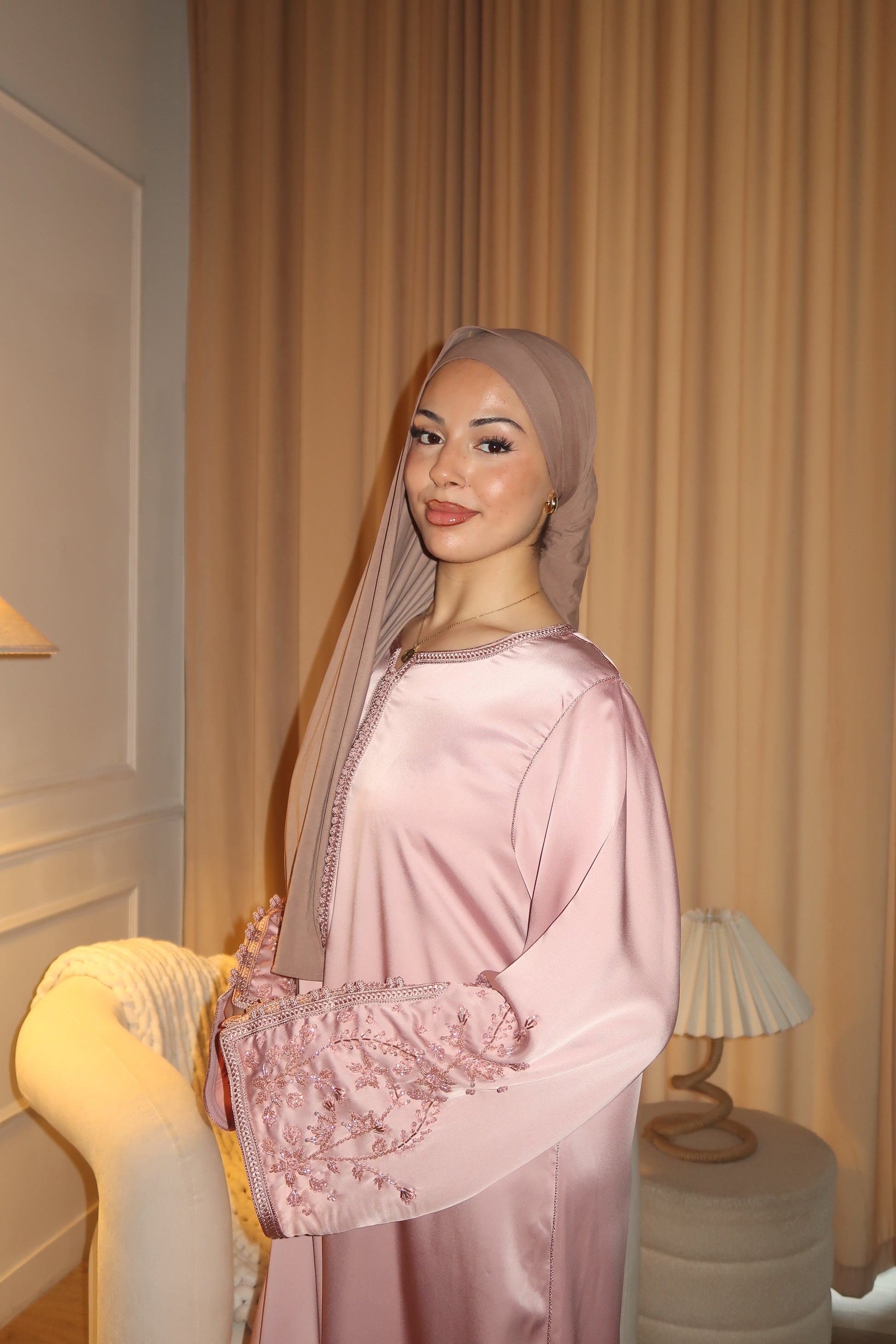 Handcrafted in Morocco using drap de soie fabric with a soft, fluid drape. Finished with hand-sewn silk sfifa and oukda, and delicate beaded detailing.