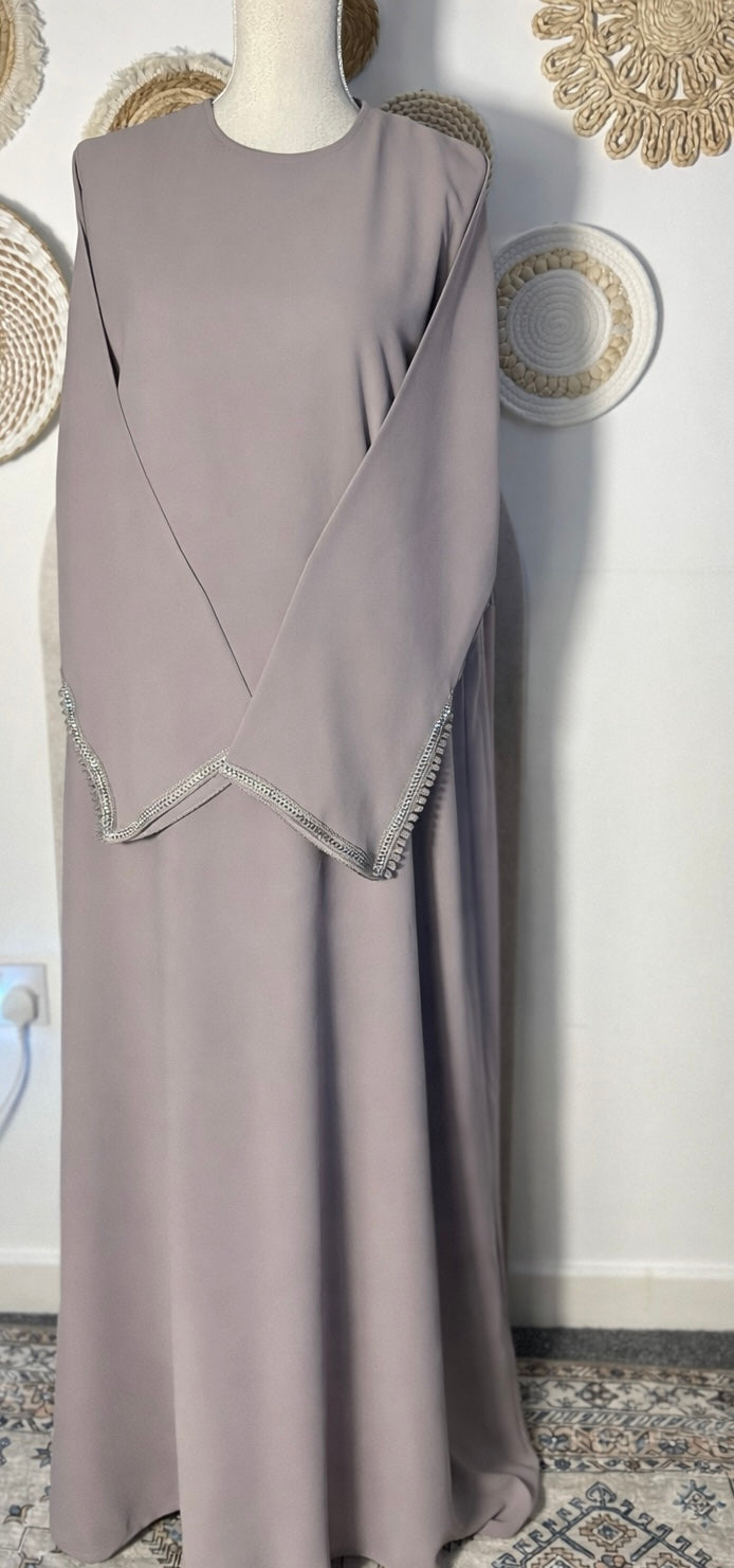 The silhouette is intentionally loose and modest, allowing the abaya to fall effortlessly on the body. Subtle embroidered detailing on the sleeves adds a delicate touch of craftsmanship while keeping the overall look minimal and timeless.
